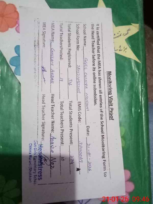 | Certified that this School was Inspected by the Undersigned MEA/DMO Today and the Information Stated Above is as Per Record. | |||||