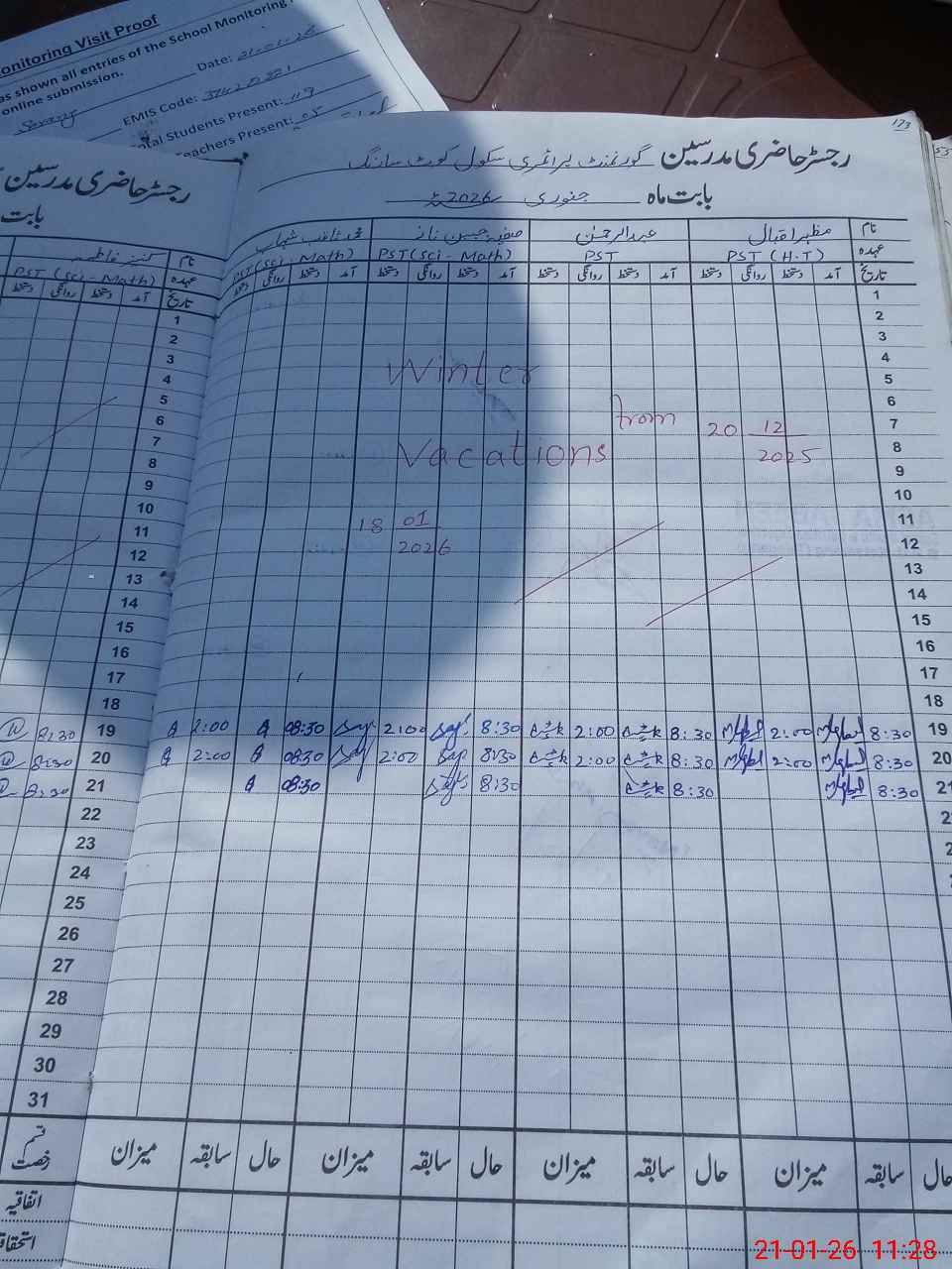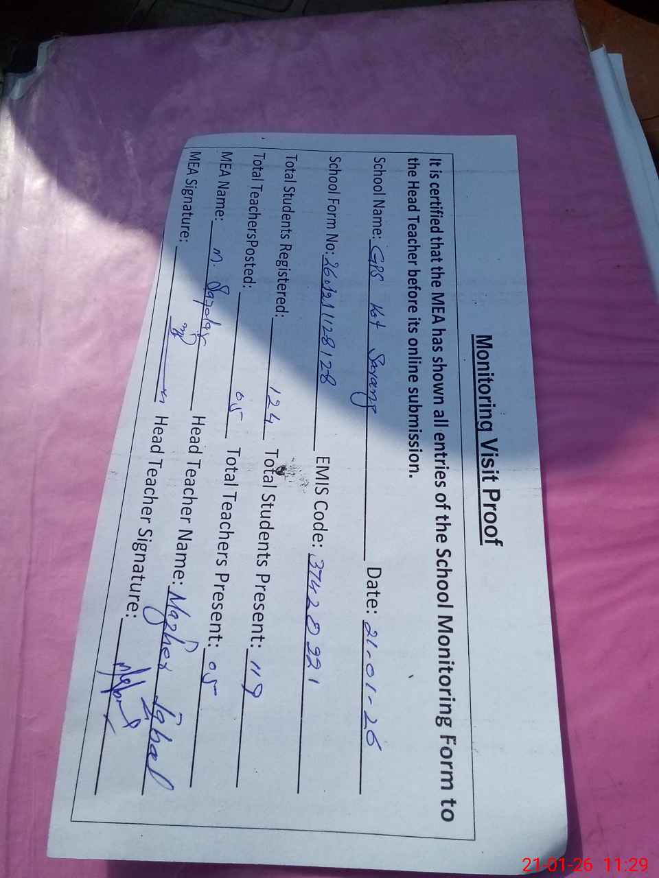 | Attendance Register | Head Teacher | MEA with School | Visit Proof |