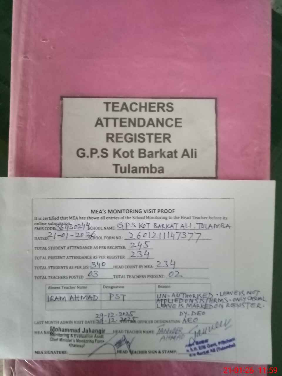 | Attendance Register | Head Teacher | MEA with School | Visit Proof |