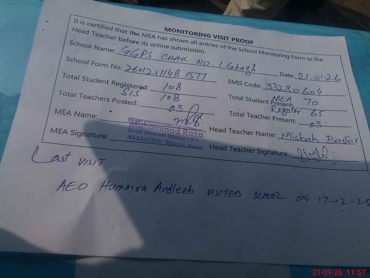 | Attendance Register | Head Teacher | MEA with School | Visit Proof |