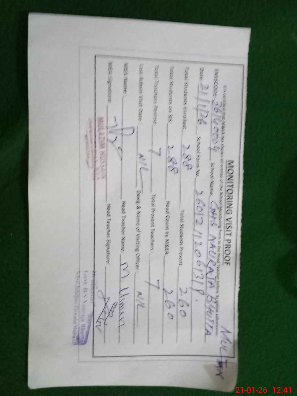 | Attendance Register | Head Teacher | MEA with School | Visit Proof |