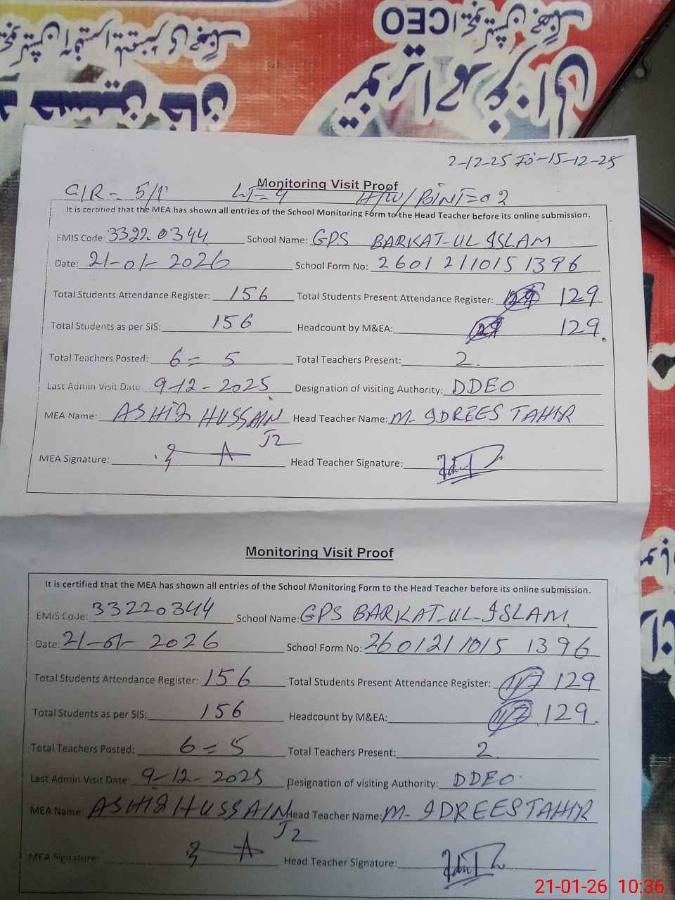 | Attendance Register | Head Teacher | MEA with School | Visit Proof |