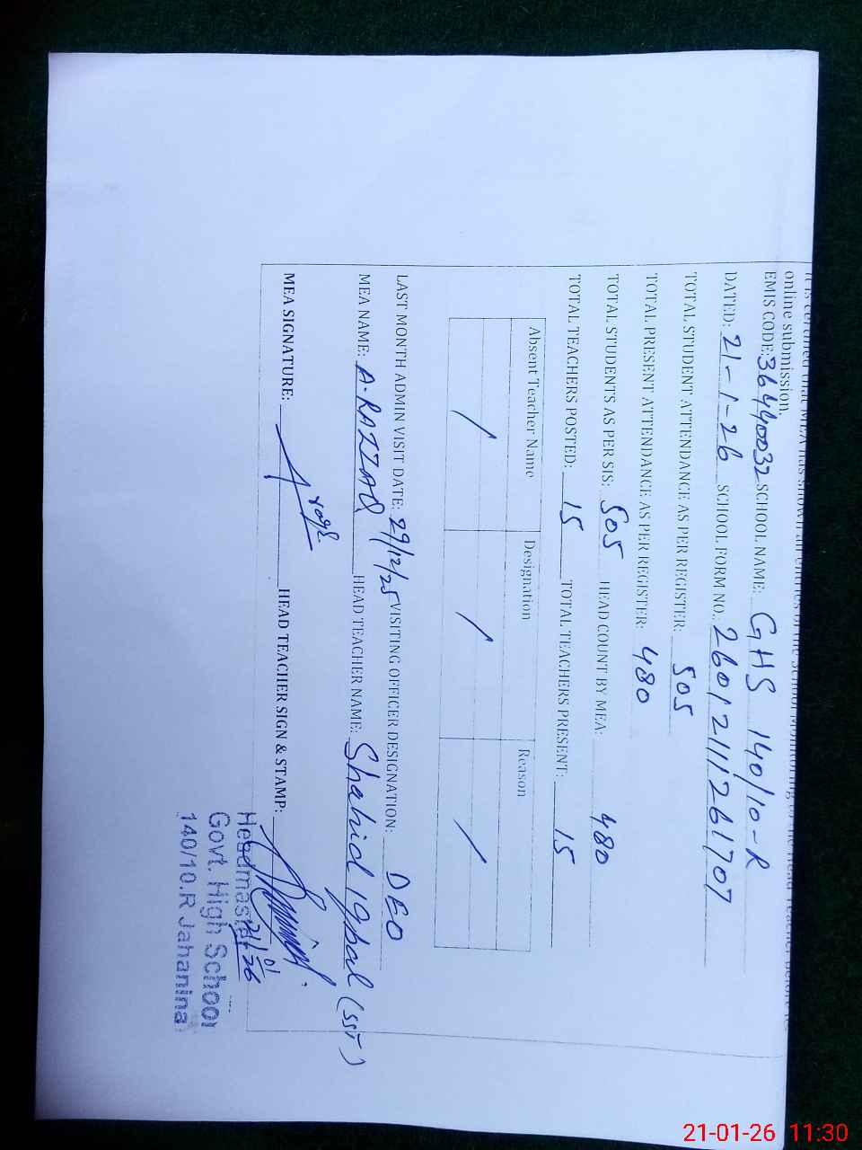 | EMIS Code: 36440032 | Name of School: GHS 140/10-R, JAHANIAN | |||