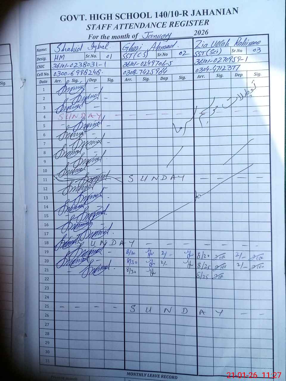 | CNIC | Full Name | Designation | R/C | Absence during last cal. month |
