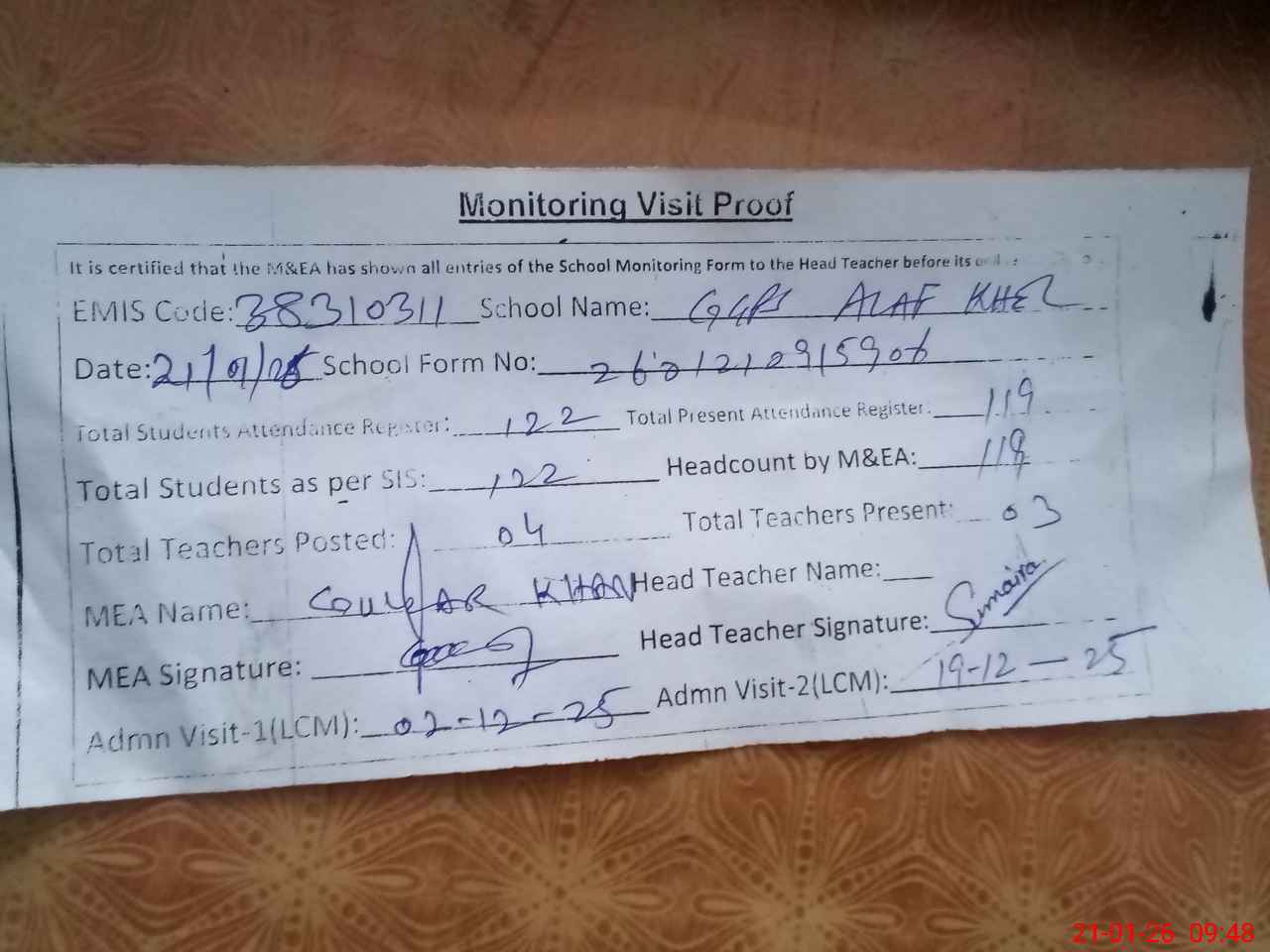| Attendance Register | Head Teacher | MEA with School | Visit Proof |