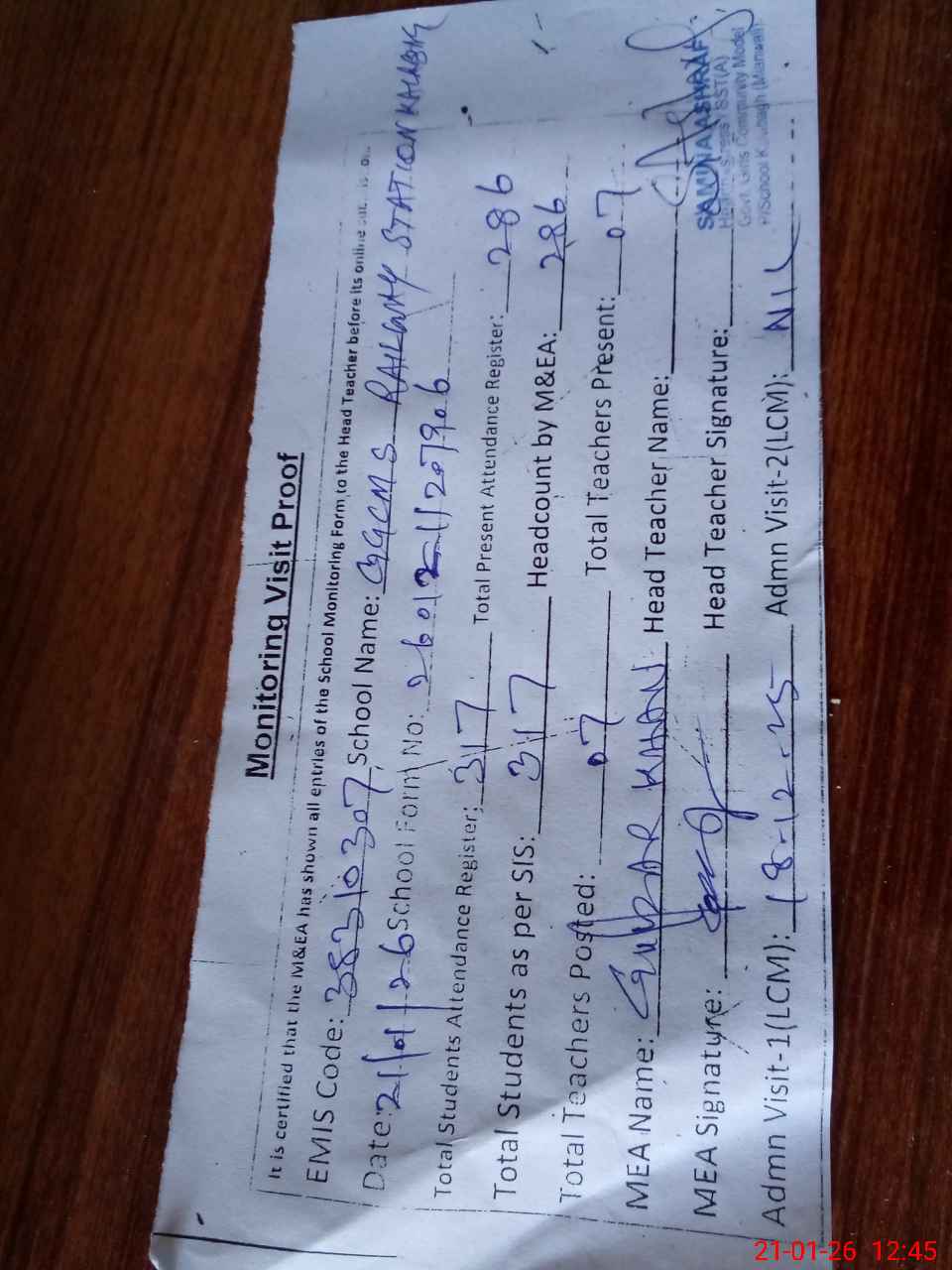 | Attendance Register | Head Teacher | MEA with School | Visit Proof |