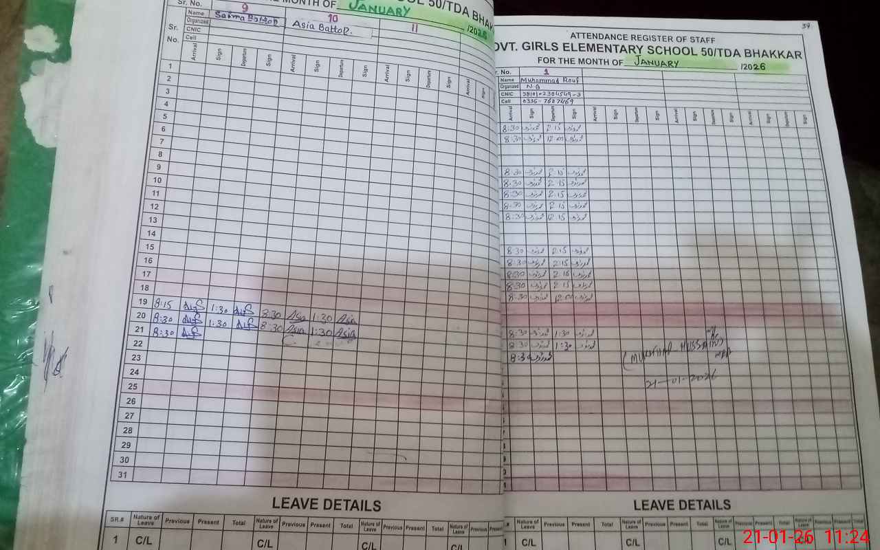 | CNIC | Full Name | Designation | R/C | Absence During Last Calender Month |