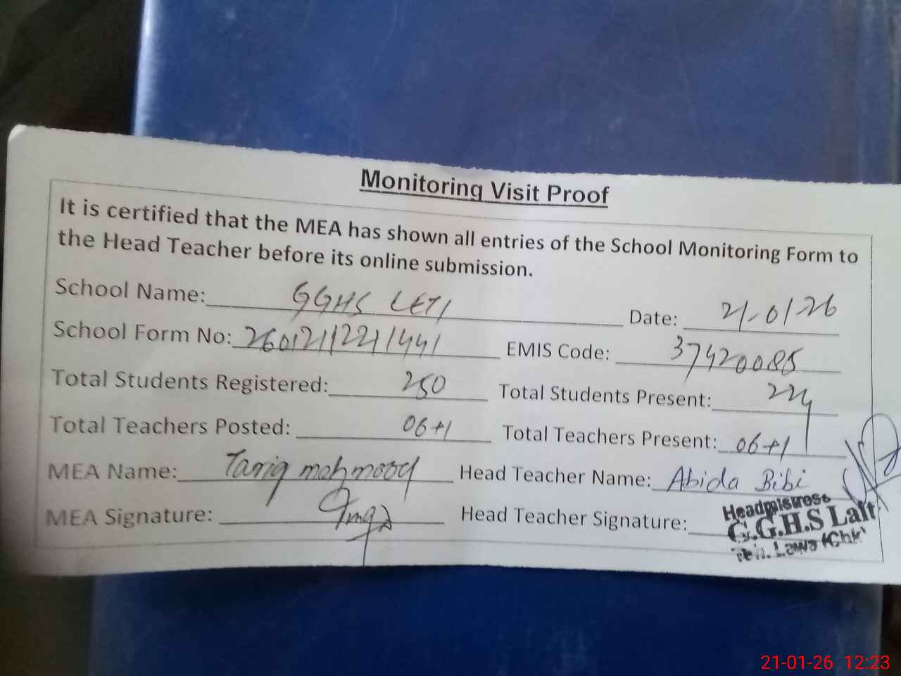 | Attendance Register | Head Teacher | MEA with School | Visit Proof |