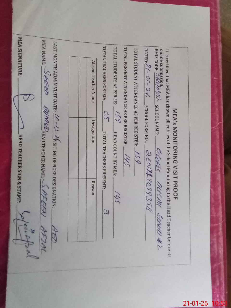 | Certified that this School was Inspected by the Undersigned MEA/DMO Today and the Information Stated Above is as Per Record. | |||||