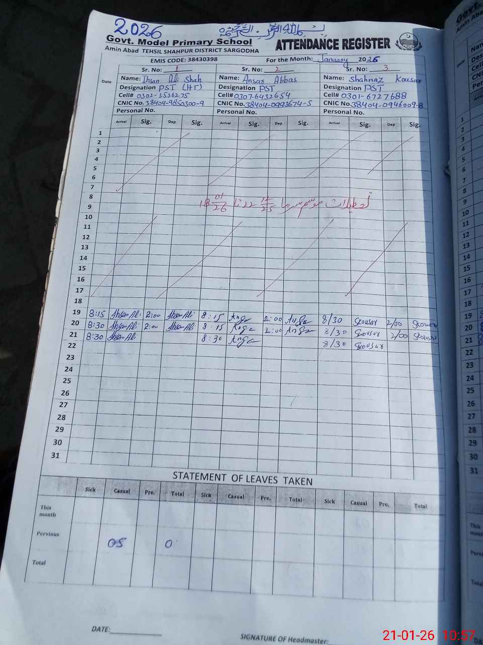 | Name: IH**** AL**** SH**** Designation: (School Headmaster's/Headmistress's) PST Phone/Cell Number: 03**** |