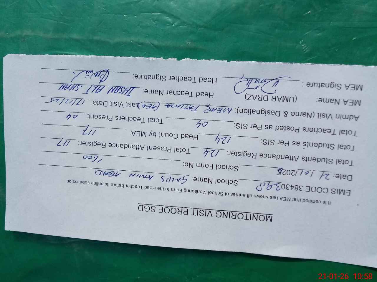 | Attendance Register | Head Teacher | MEA with School | Visit Proof |
