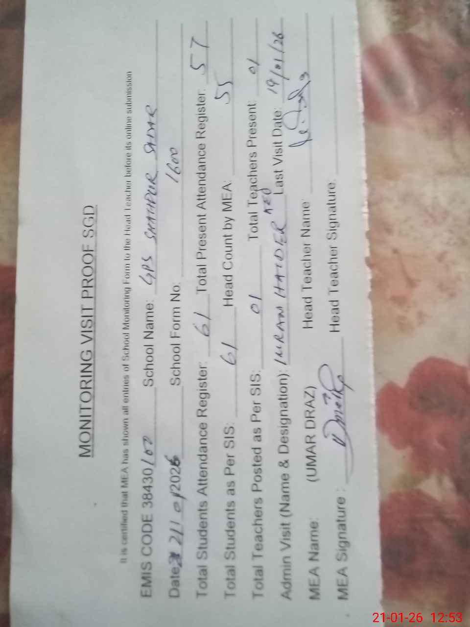 | Attendance Register | Head Teacher | MEA with School | Visit Proof |