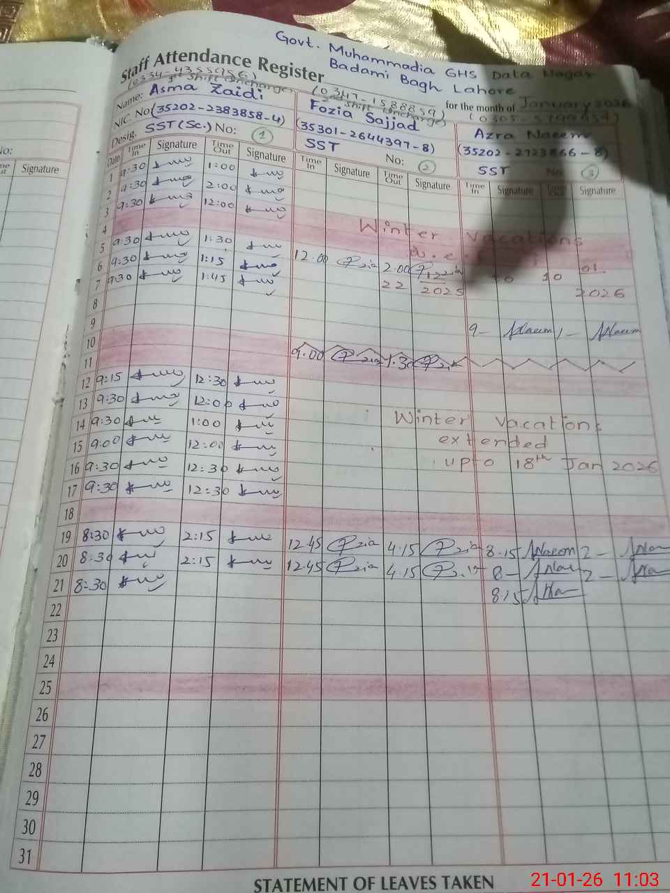 | 35**** | Sa**** Ak**** | SSE Physics/Maths | Contract | 0 | 0 | 31 | 0 | 0 | 0 | 0 | 0 | 0 | Absent (Un-Authorized) |