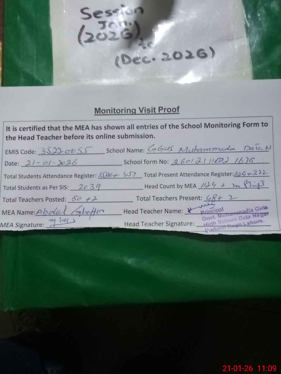 | Attendance Register | Head Teacher | MEA with School | Visit Proof |