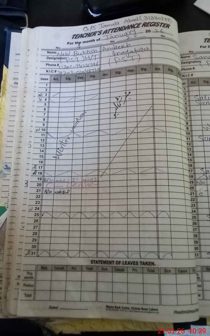 | Name: NA**** BU**** Designation: (School Headmaster's/Headmistress's) PST/PTC/JV Phone/Cell Number: 03**** |