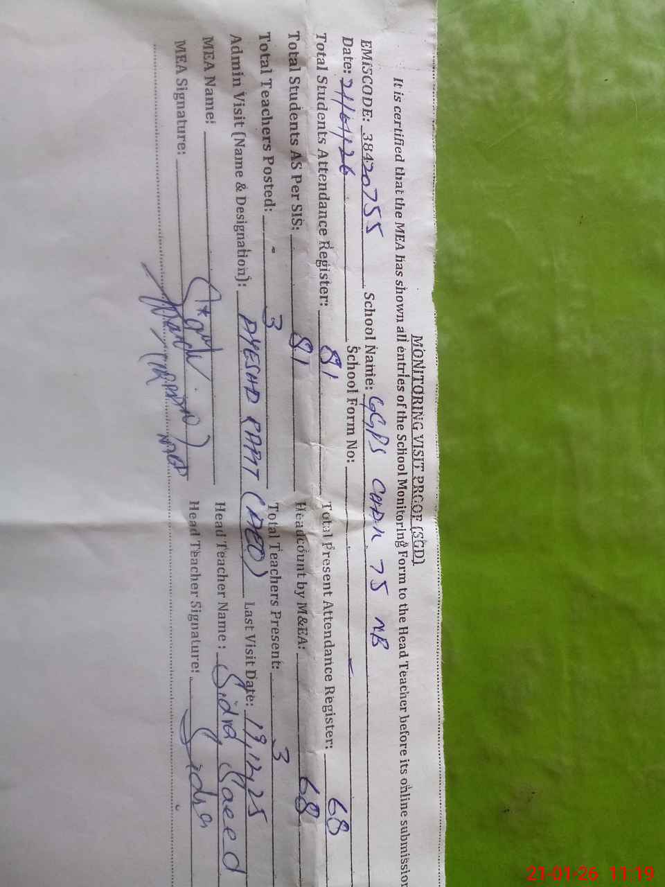 | Attendance Register | Head Teacher | MEA with School | Visit Proof |