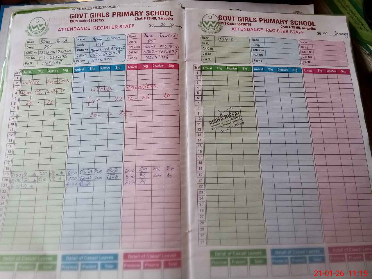 | Name: SI**** SA**** Designation: (School Headmaster's/Headmistress's) PST Phone/Cell Number: 03**** |
