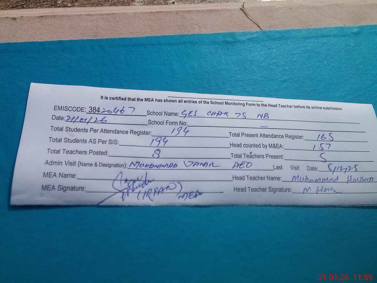 | Attendance Register | Head Teacher | MEA with School | Visit Proof |