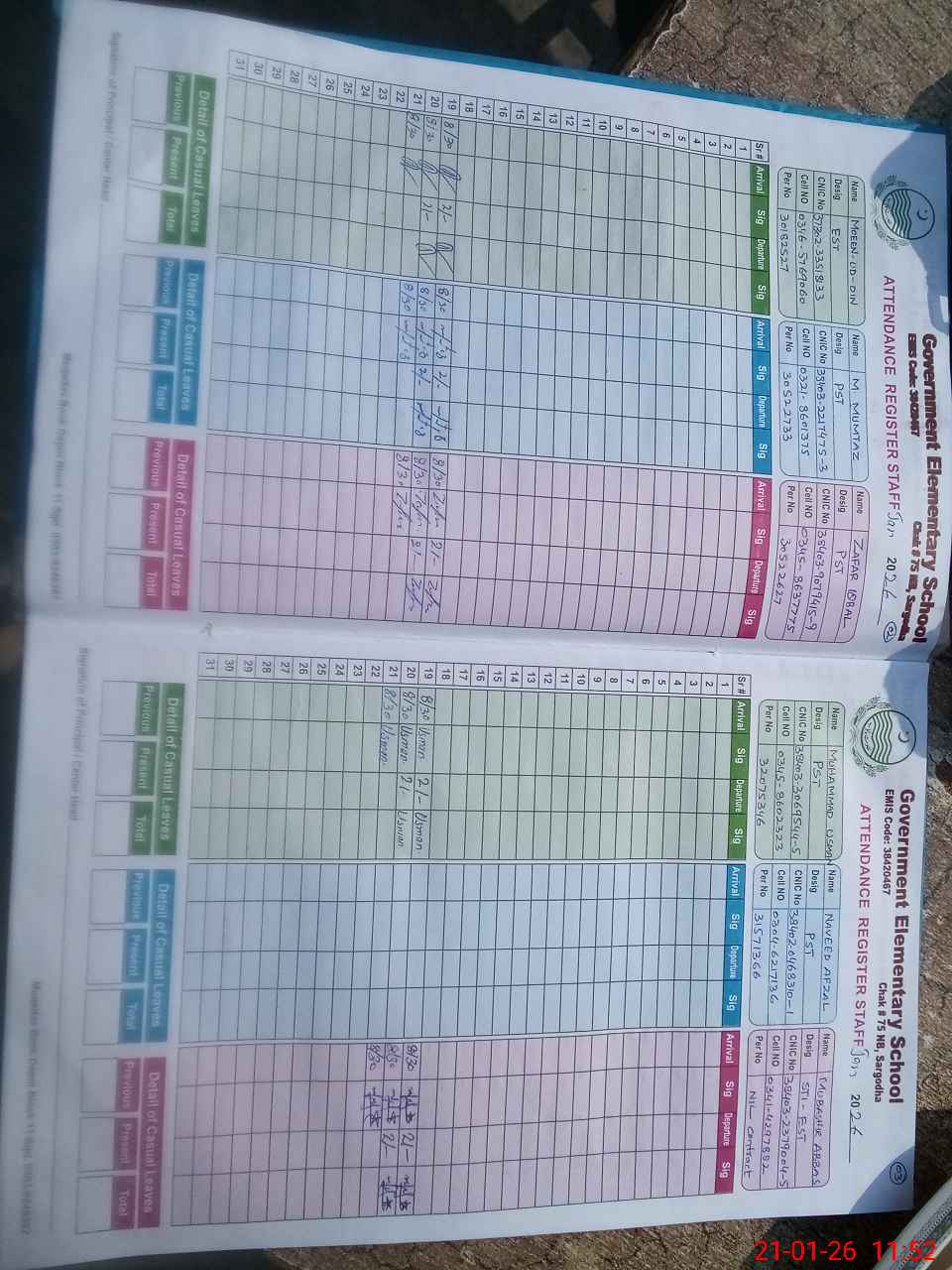 | CNIC | Full Name | Designation | R/C | Absence during last cal. month |