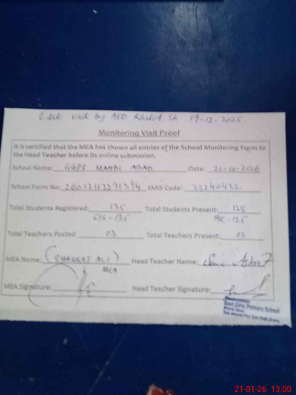 | Attendance Register | Head Teacher | MEA with School | Visit Proof |