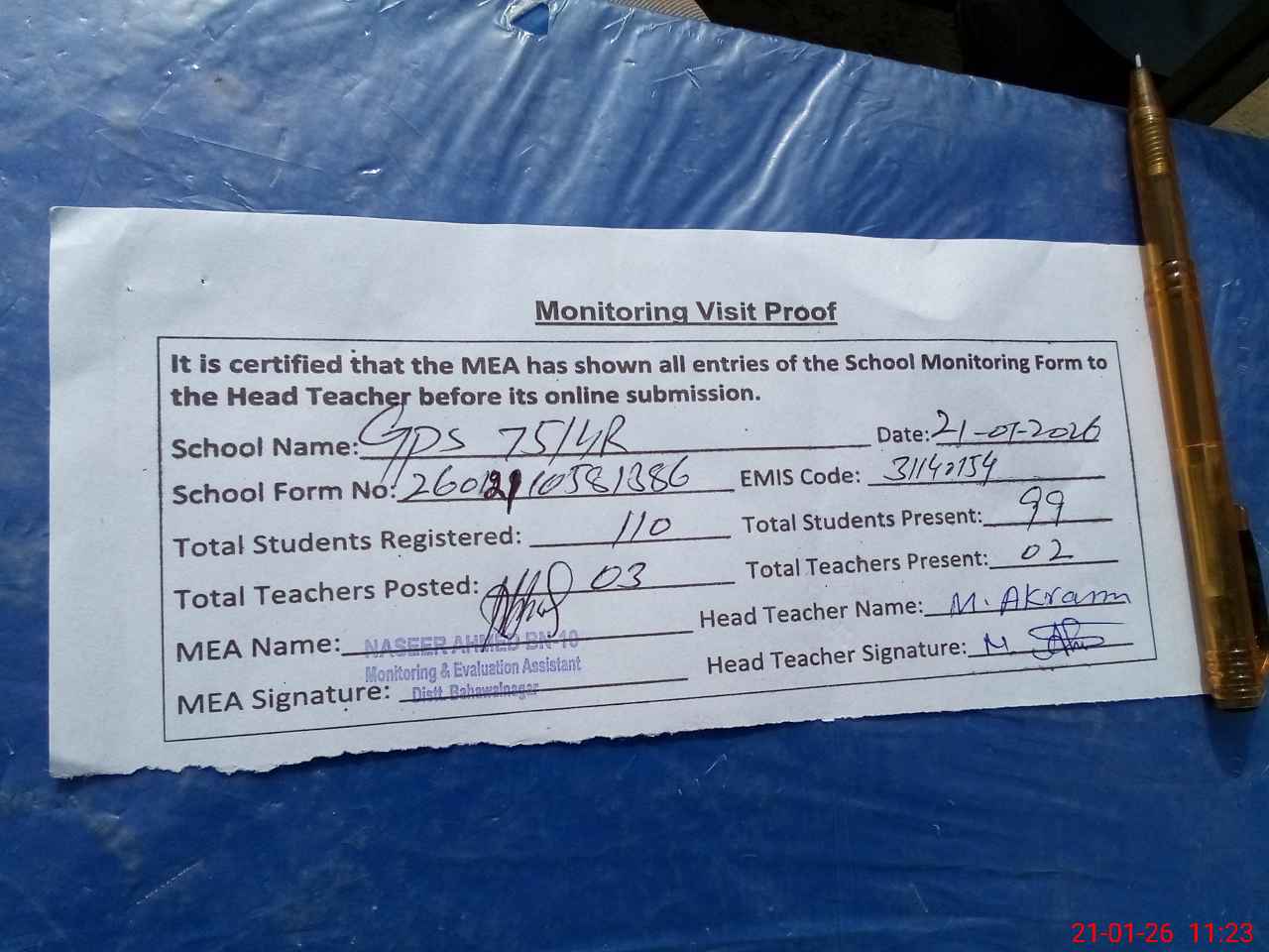 | EMIS Code: 31140154 | Name of School: GPS CHAK NO. 75/4-R | |||