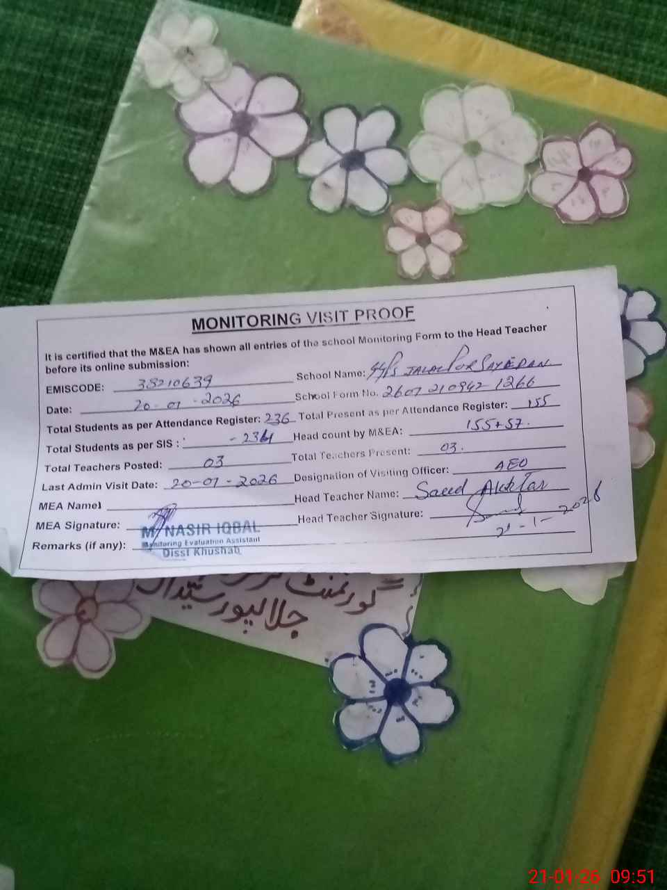 | Attendance Register | Head Teacher | MEA with School | Visit Proof |