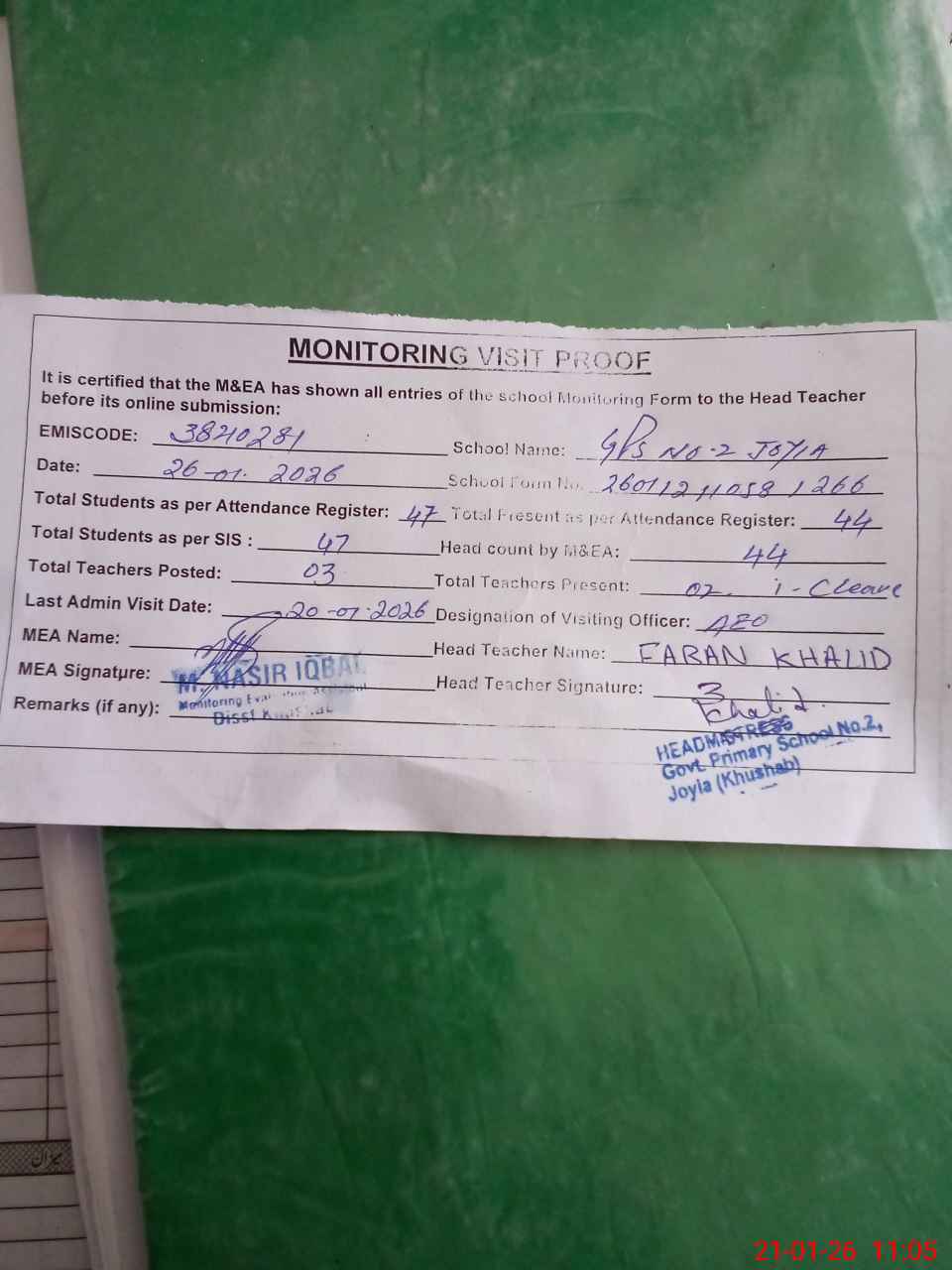 | Attendance Register | Head Teacher | MEA with School | Visit Proof |