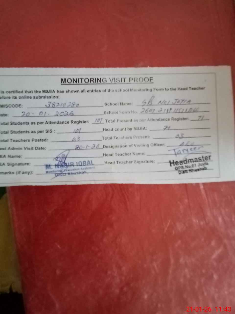 | EMIS Code: 38210280 | Name of School: GPS NO. 1 JOYIA | |||