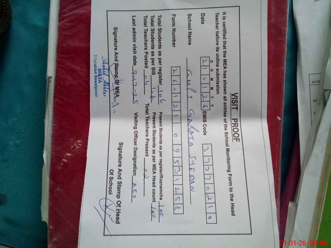 | Attendance Register | Head Teacher | MEA with School | Visit Proof |