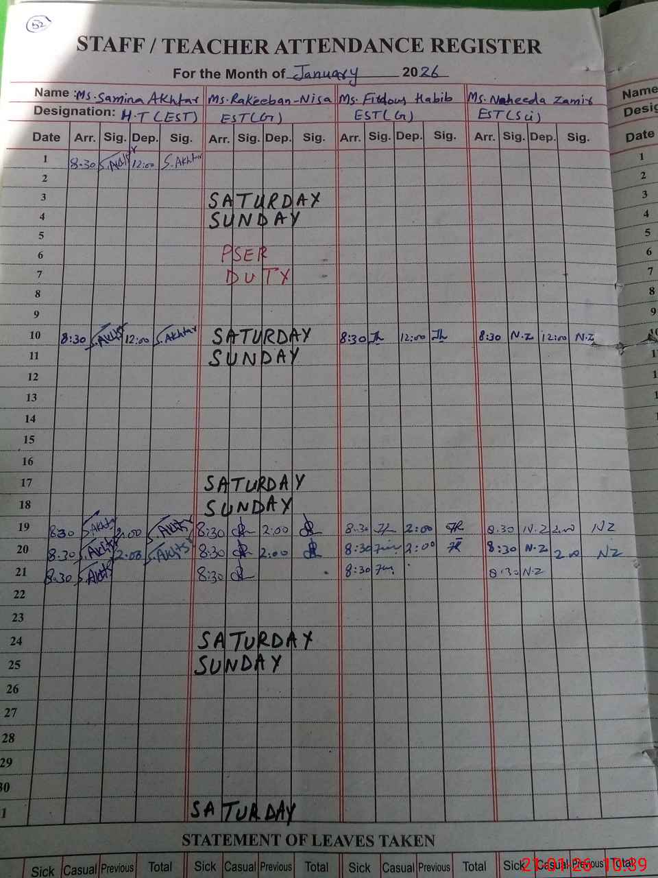 | Leave | Duty | Absent | Maternity | Medical | Ex- Pak |