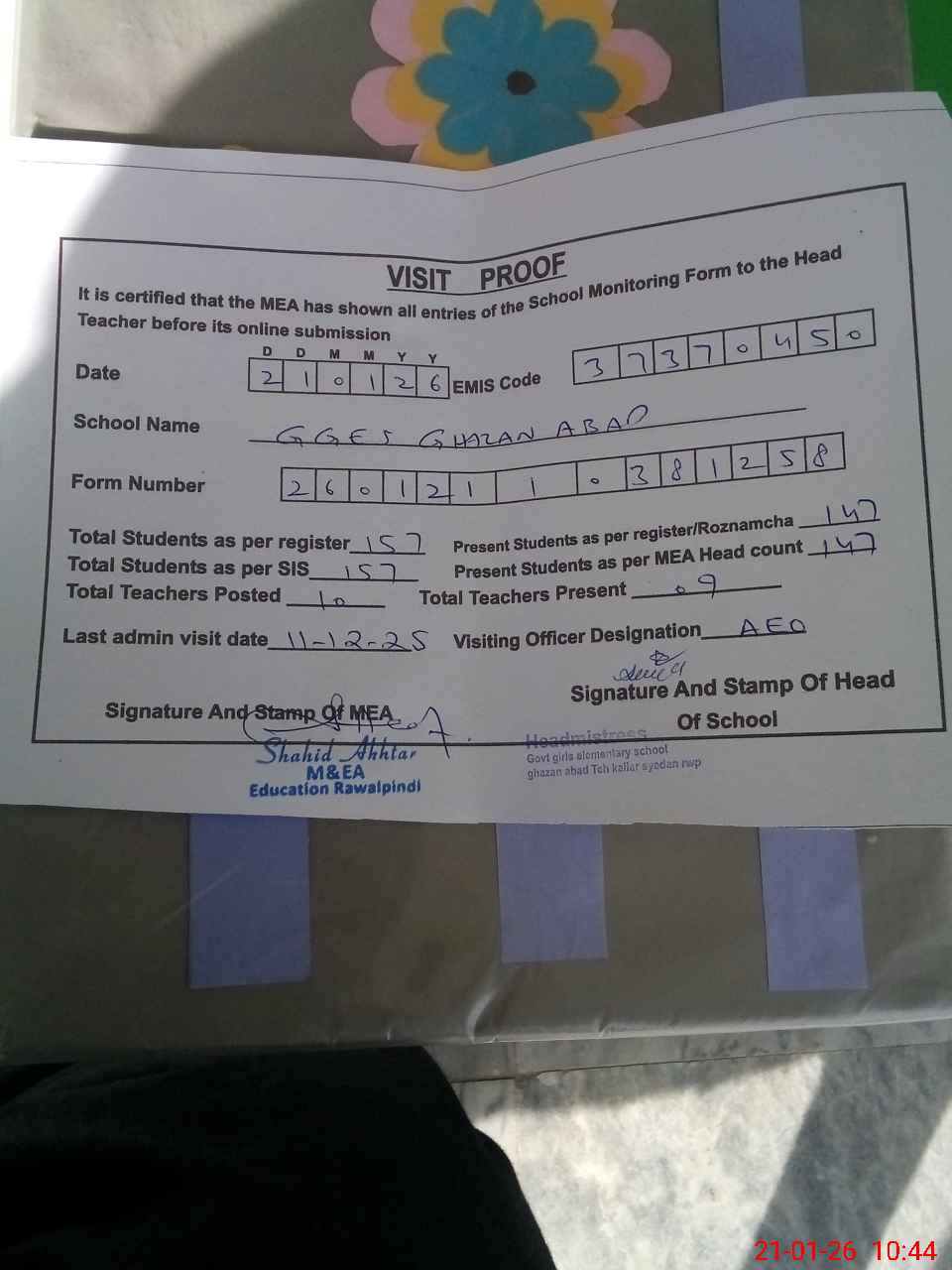 | Attendance Register | Head Teacher | MEA with School | Visit Proof |