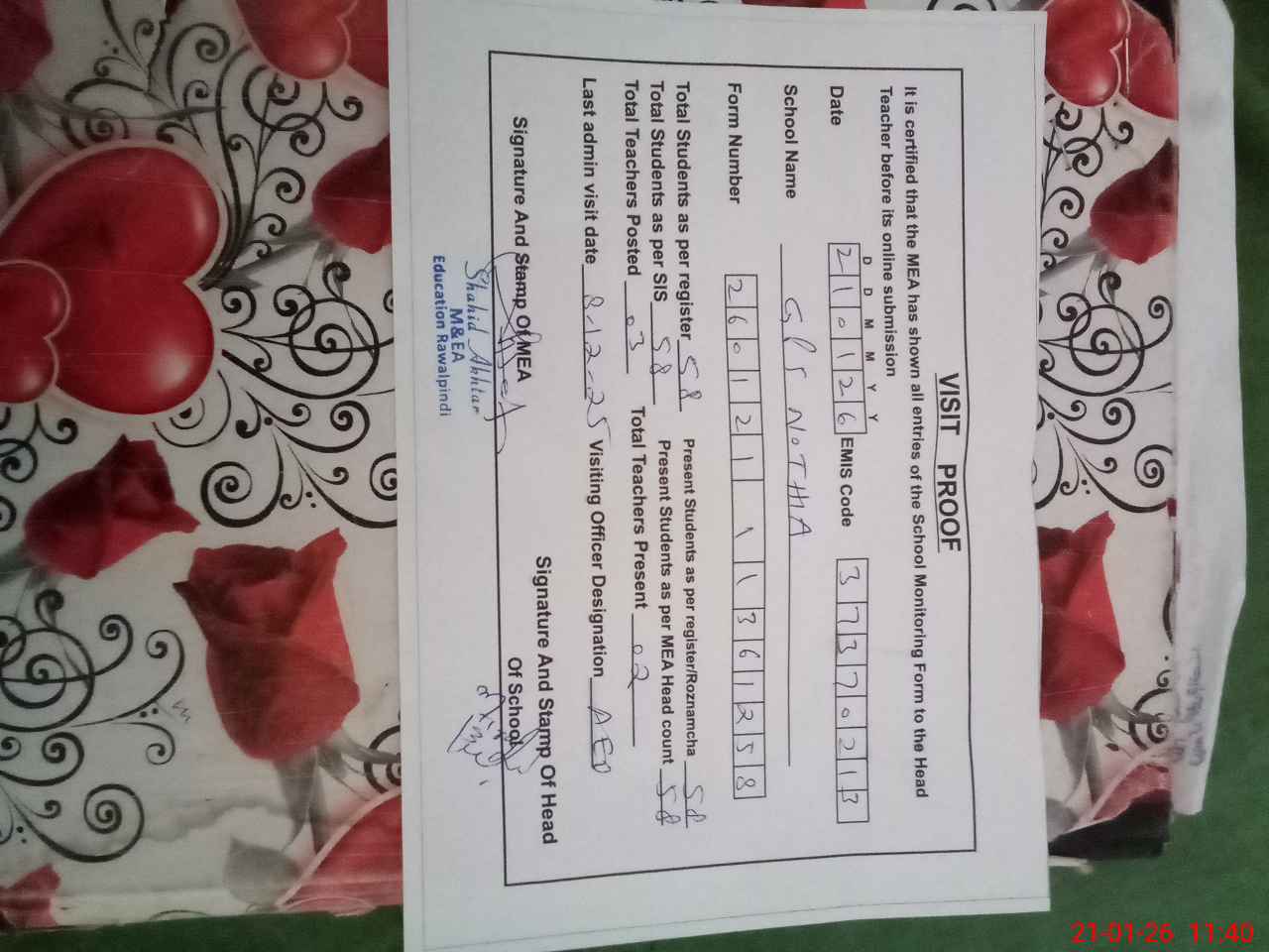 | Certified that this School was Inspected by the Undersigned MEA/DMO Today and the Information Stated Above is as Per Record. | |||||