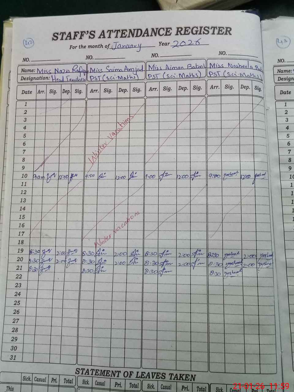 | Leave | Duty | Absent | Maternity | Medical | Ex- Pak |
