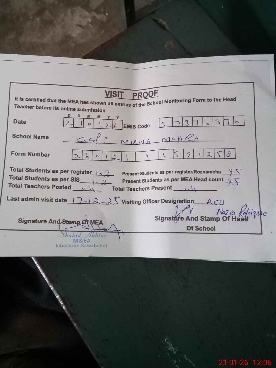 | Attendance Register | Head Teacher | MEA with School | Visit Proof |