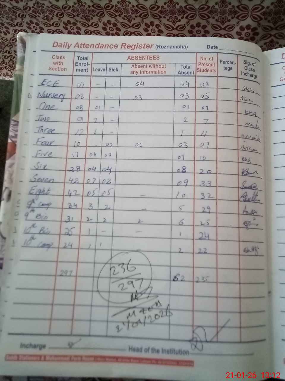 | Total Students Present | 0 | 3 | 7 | 7 | 11 | 7 | 11 | 20 | 33 | 32 | 54 | 46 | 236 | |||