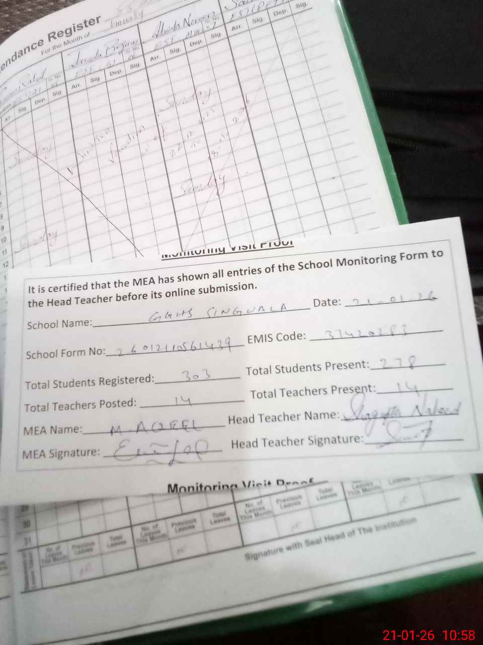 | Attendance Register | Head Teacher | MEA with School | Visit Proof |