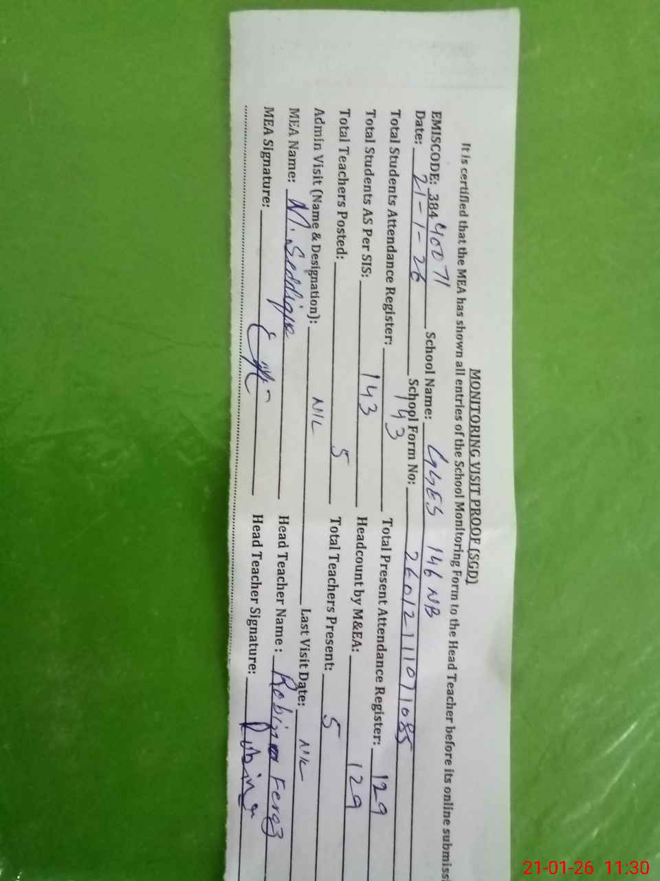 | Attendance Register | Head Teacher | MEA with School | Visit Proof |