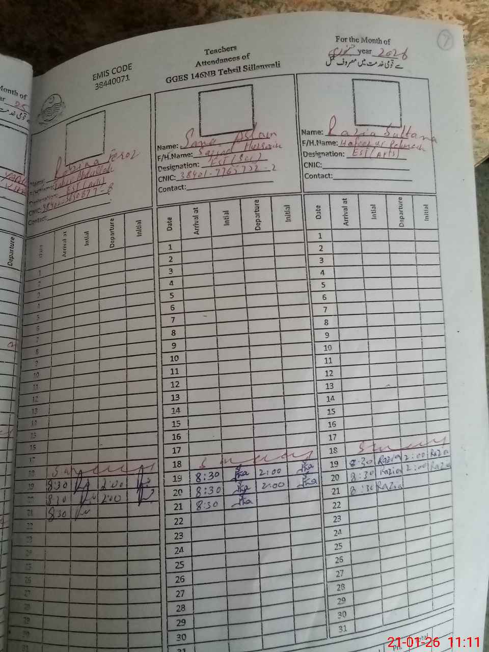 | CNIC | Full Name | Designation | R/C | Absence During Last Calender Month |
