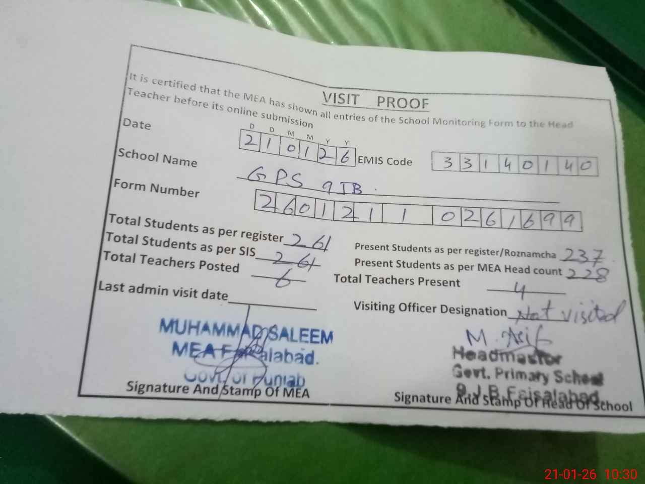 | Attendance Register | Head Teacher | MEA with School | Visit Proof |