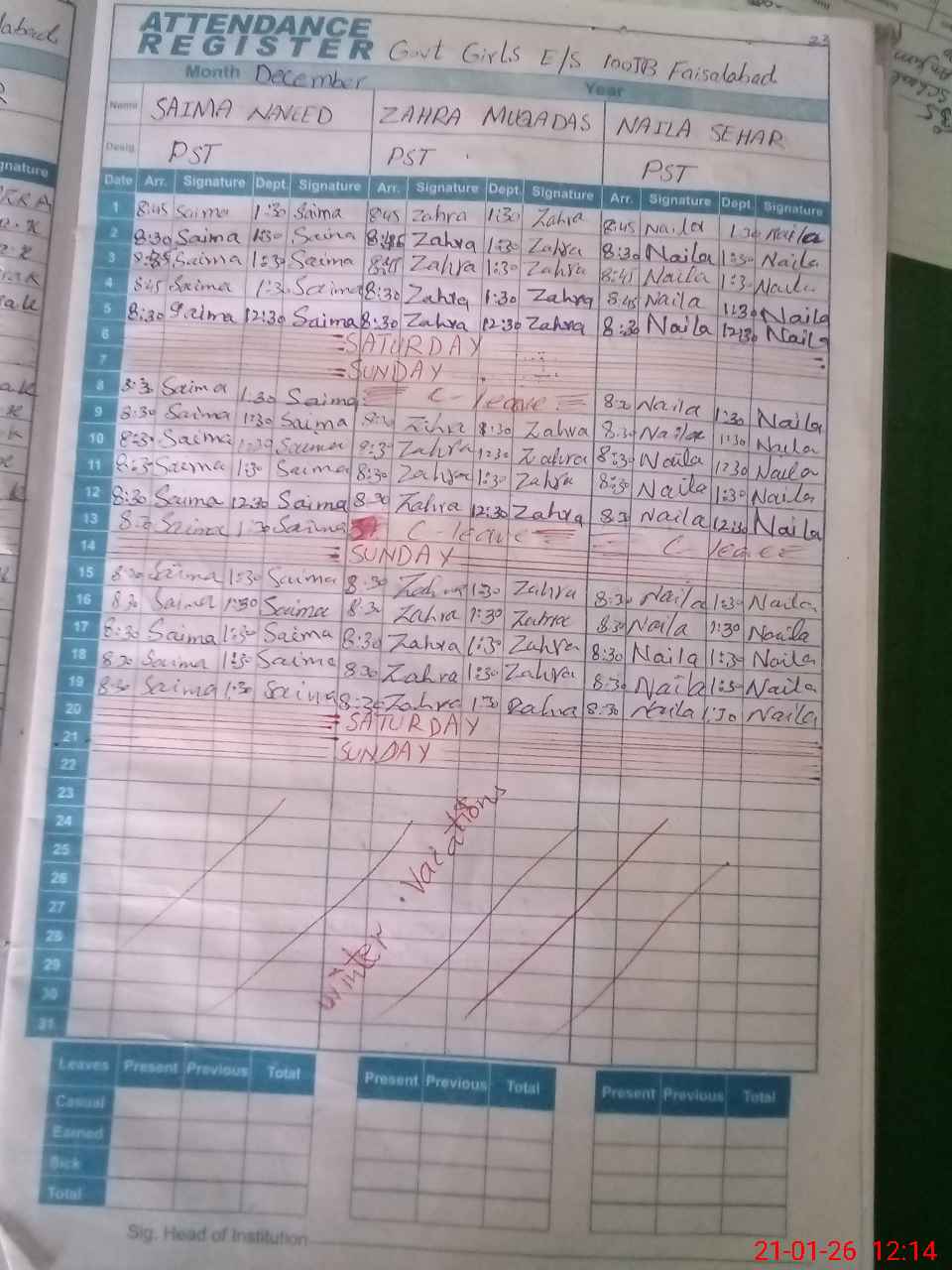 | CNIC | Full Name | Designation | R/C | Absence During Last Calender Month |