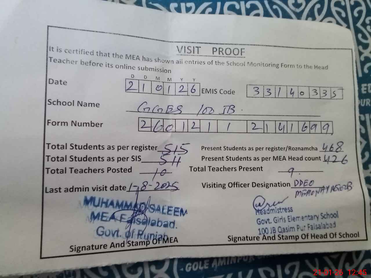 | Attendance Register | Head Teacher | MEA with School | Visit Proof |