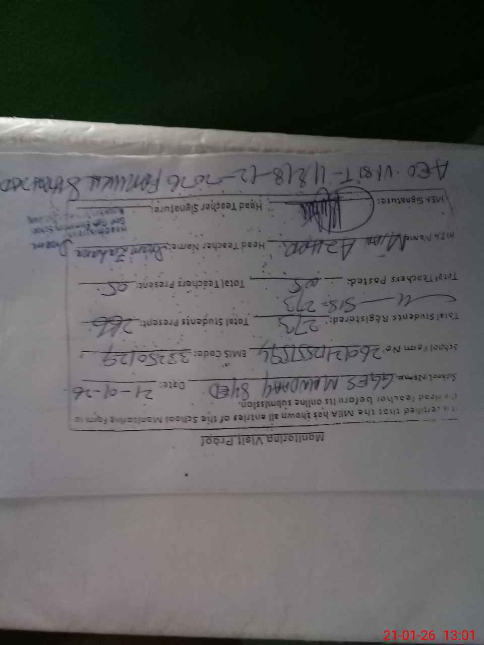 | Attendance Register | Head Teacher | MEA with School | Visit Proof |
