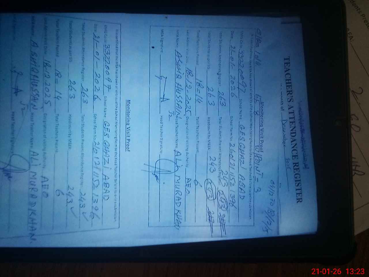 | Attendance Register | Head Teacher | MEA with School | Visit Proof |