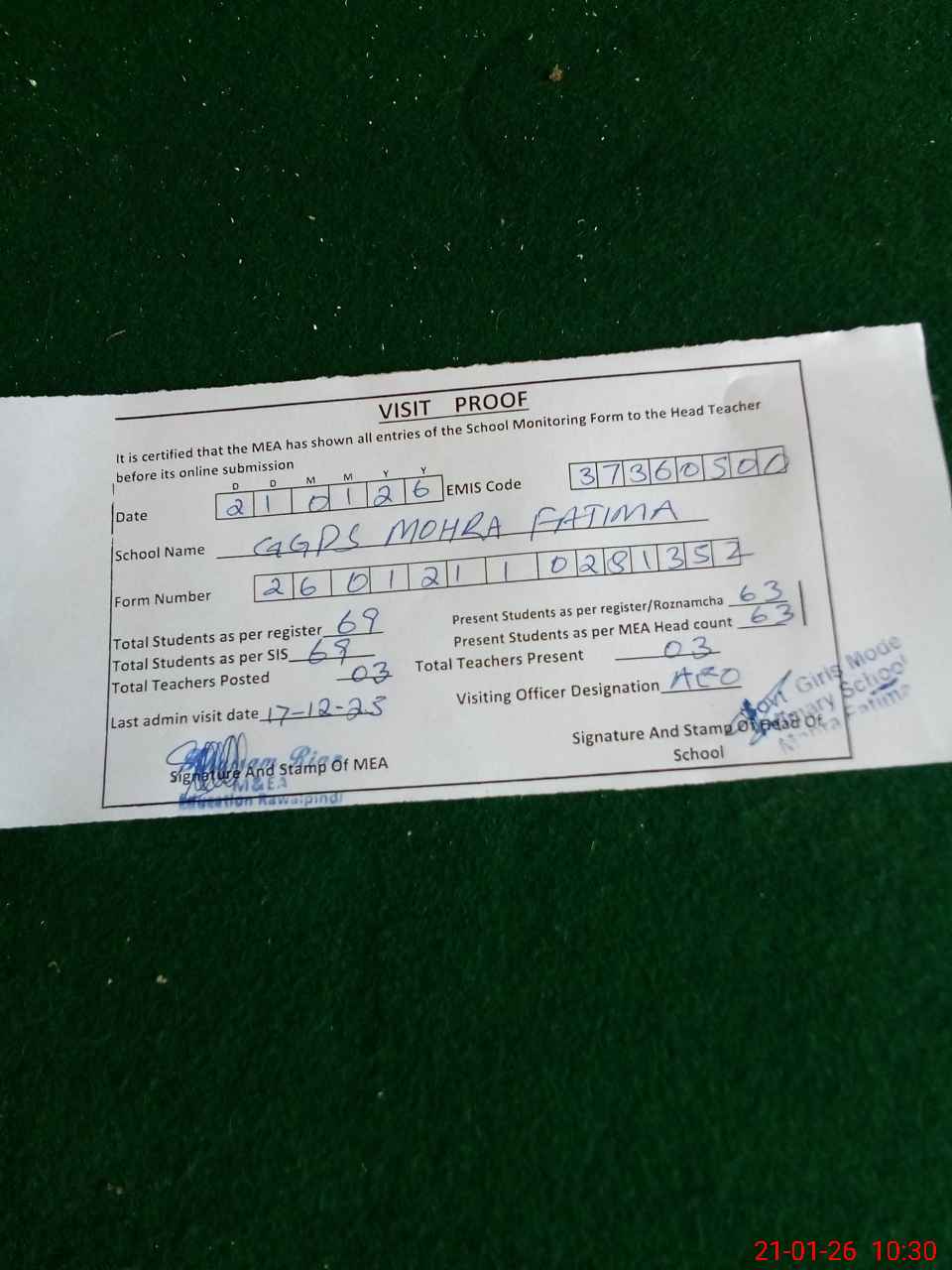 | Attendance Register | Head Teacher | MEA with School | Visit Proof |