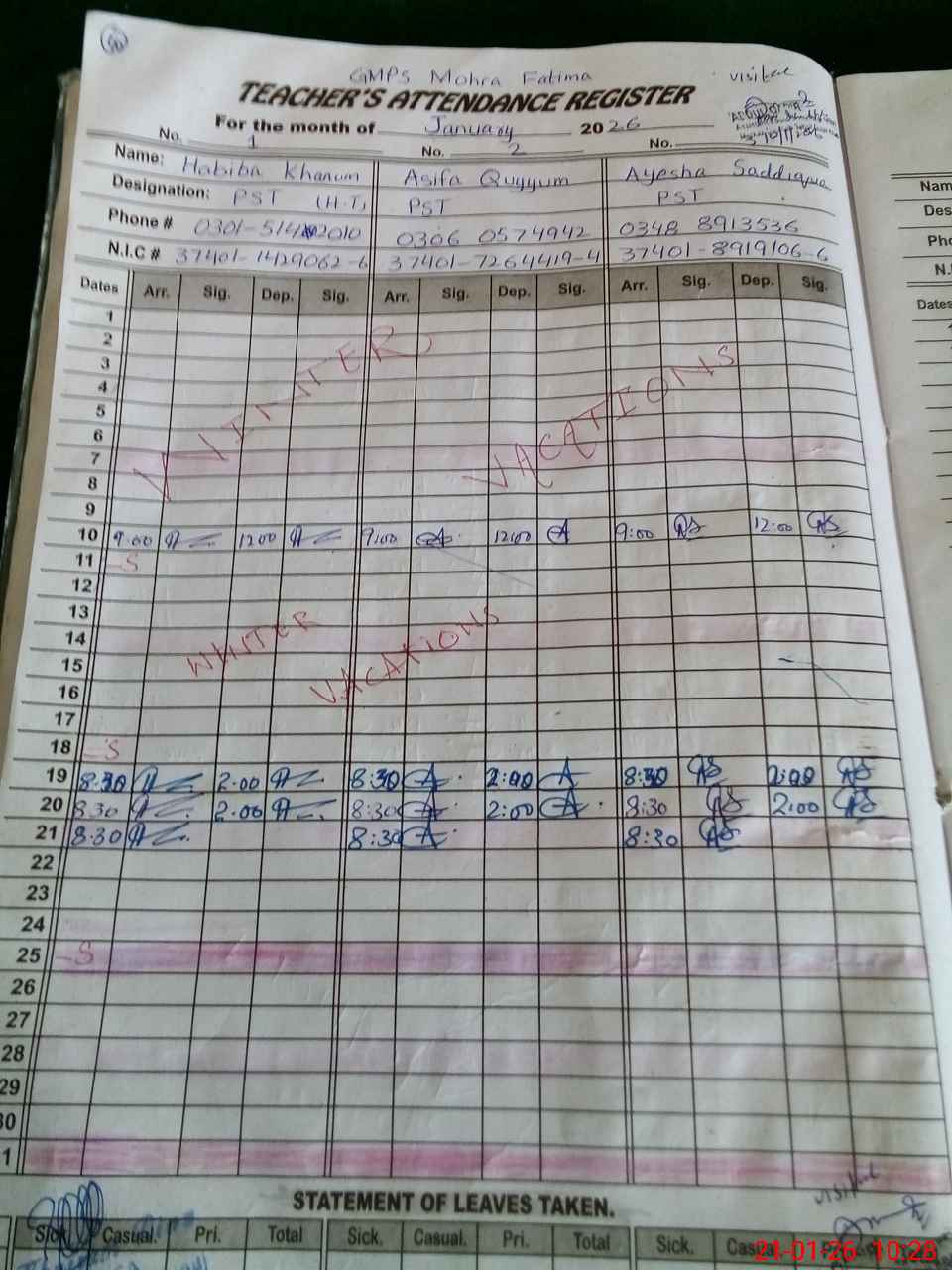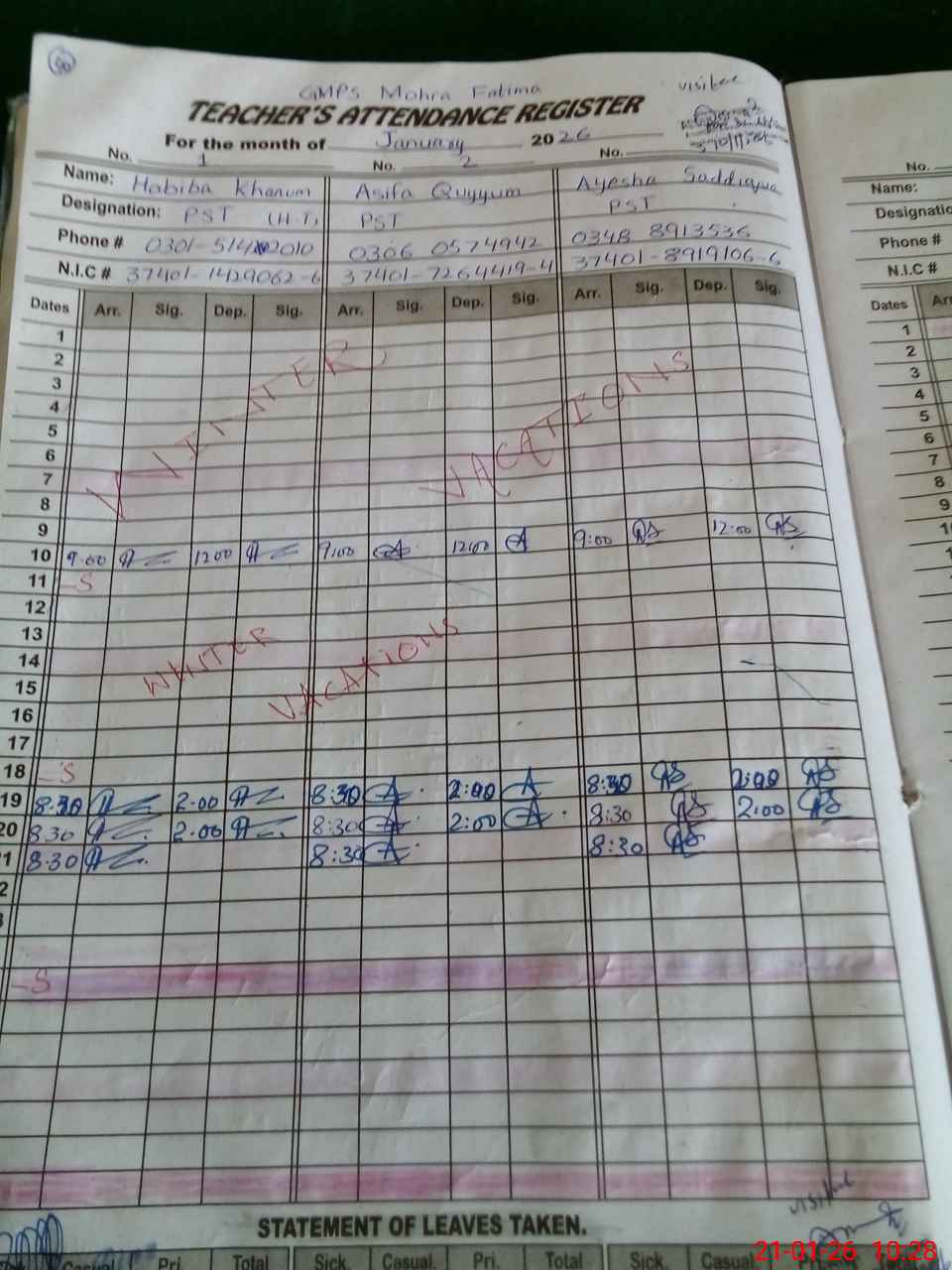 | CNIC | Full Name | Designation | R/C | Absence During Last Calender Month |