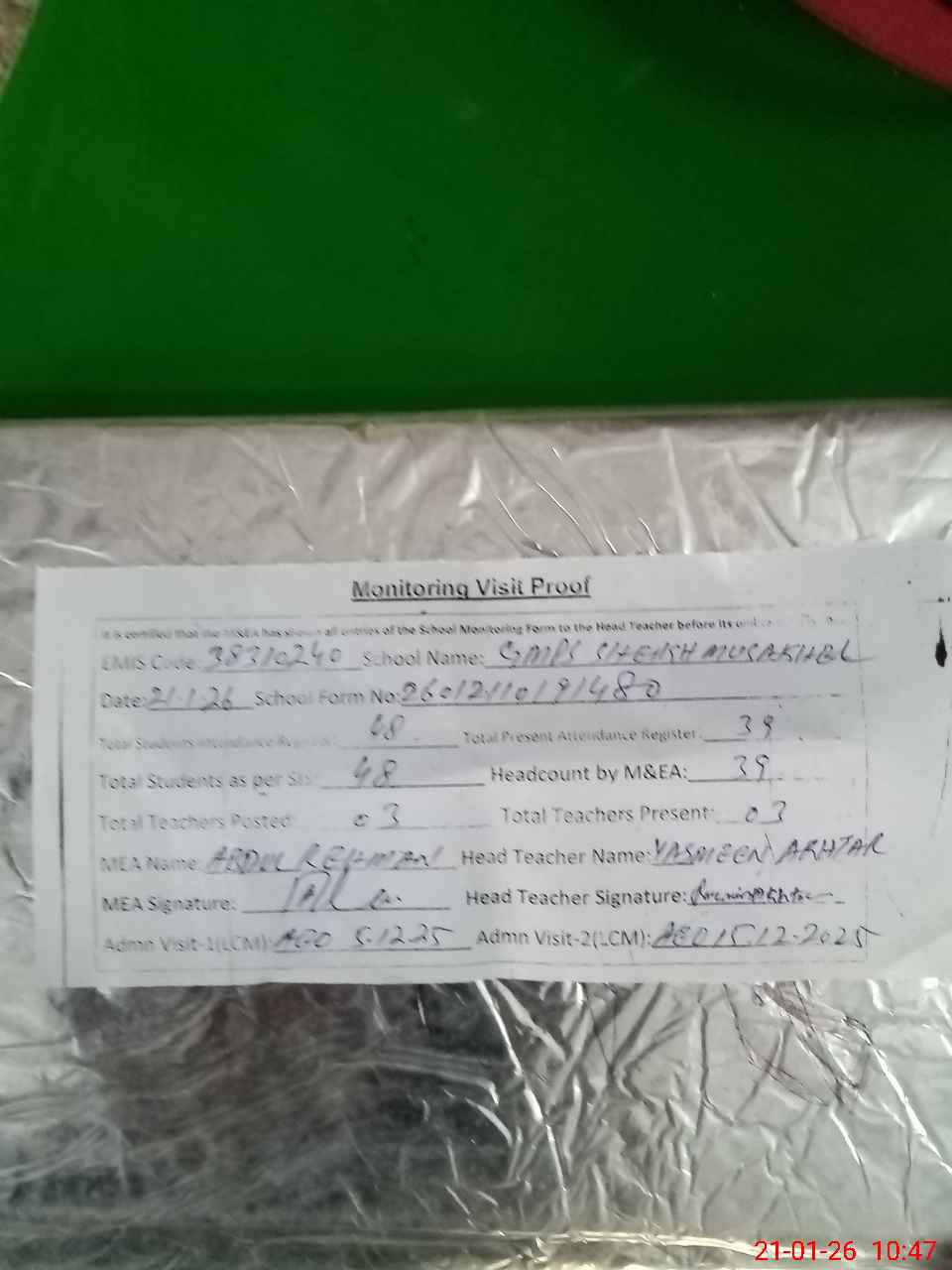 | Attendance Register | Head Teacher | MEA with School | Visit Proof |