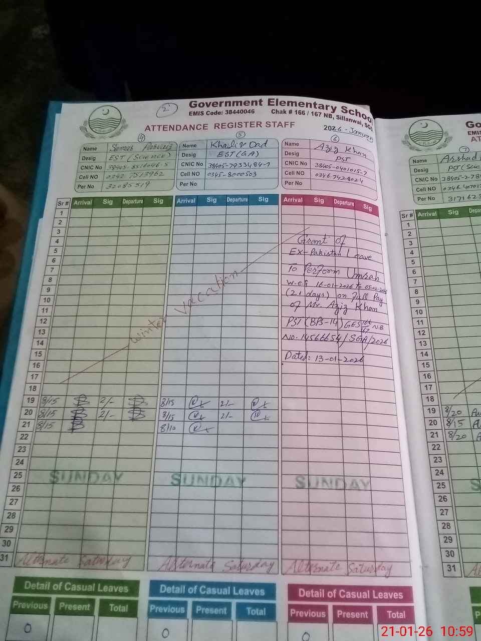 | CNIC | Full Name | Designation | R/C | Absence During Last Calender Month |