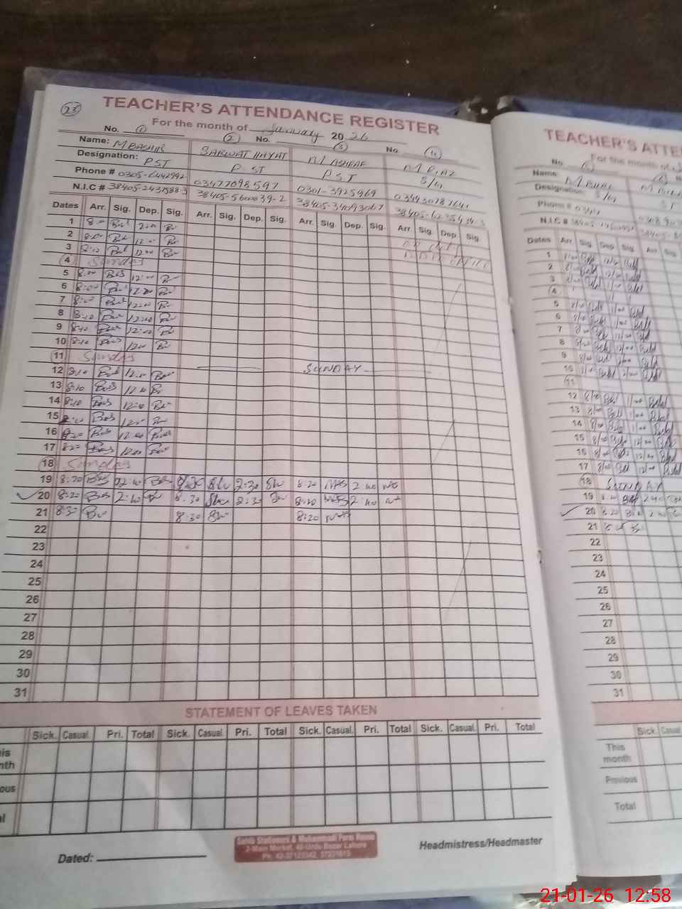 | CNIC | Full Name | Designation | R/C | Absence During Last Calender Month |