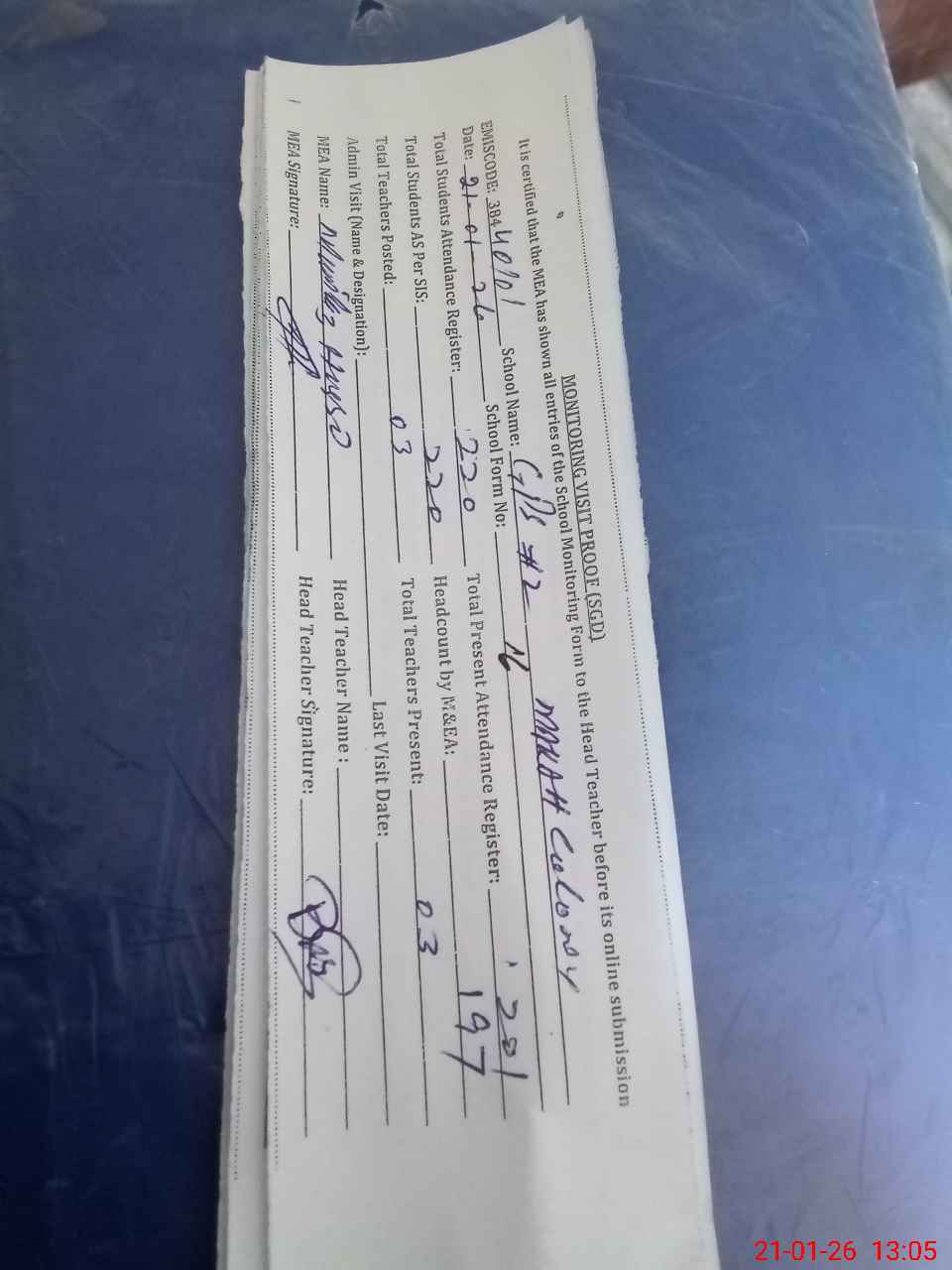| Attendance Register | Head Teacher | MEA with School | Visit Proof |
