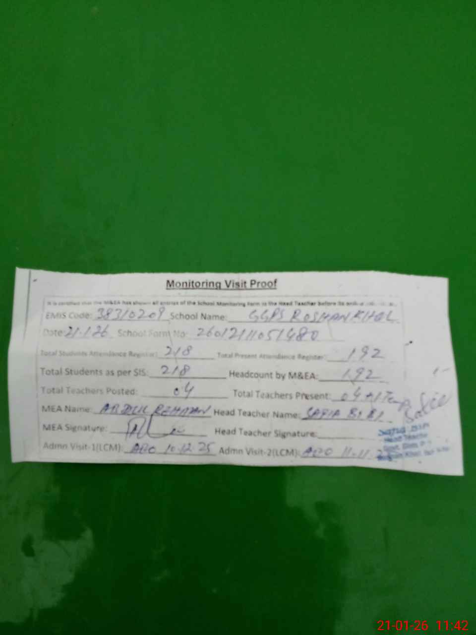| EMIS Code: 38310209 | Name of School: GGPS ROSHAN KHEL | |||